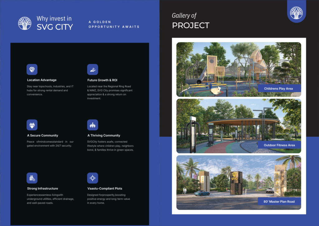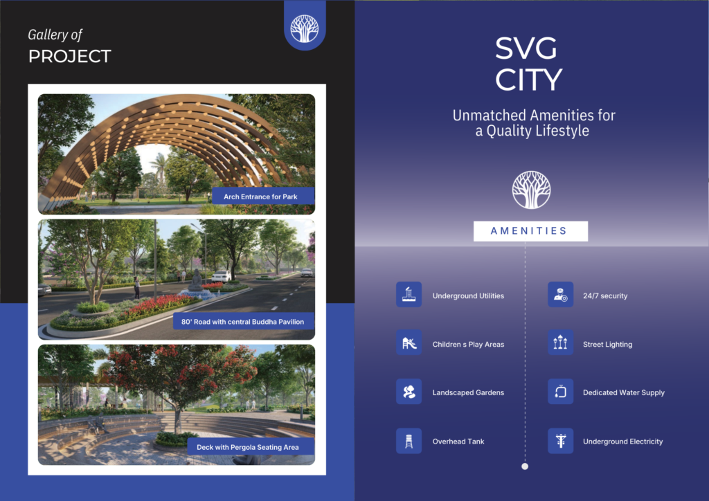 - Amenities Outdoor Shower Lawn HMDA Approved Premium Plots Gated Community Standard CC Roads Curbing Stones Underground Sewage Underground Cabling Electricity Lines with Street Lights Avenue Plantation Overhead Water Tank Water Harvesting Solar Fencing Compound Wall Entrance Arch Each Plot Fencing Integrated Luxury Gated Community Promising Investment Zone Sustainable & ECO Friendly HMDA & RERA Approved