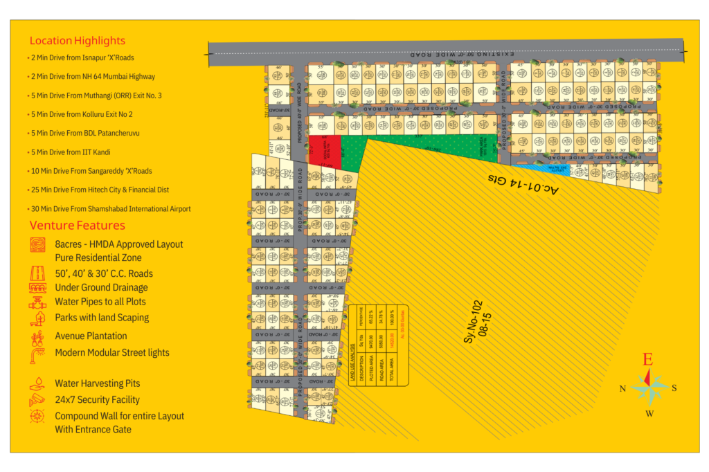 - Amenities HMDA Approved Premium Plots Gated Community Standard CC Roads Curbing Stones Underground Sewage Underground Cabling Electricity Lines with Street Lights Avenue Plantation Overhead Water Tank Water Harvesting Solar Fencing Compound Wall Entrance Arch Promising Investment Zone Sustainable & ECO Friendly HMDA & RERA Approved 100+ World Class Amenities